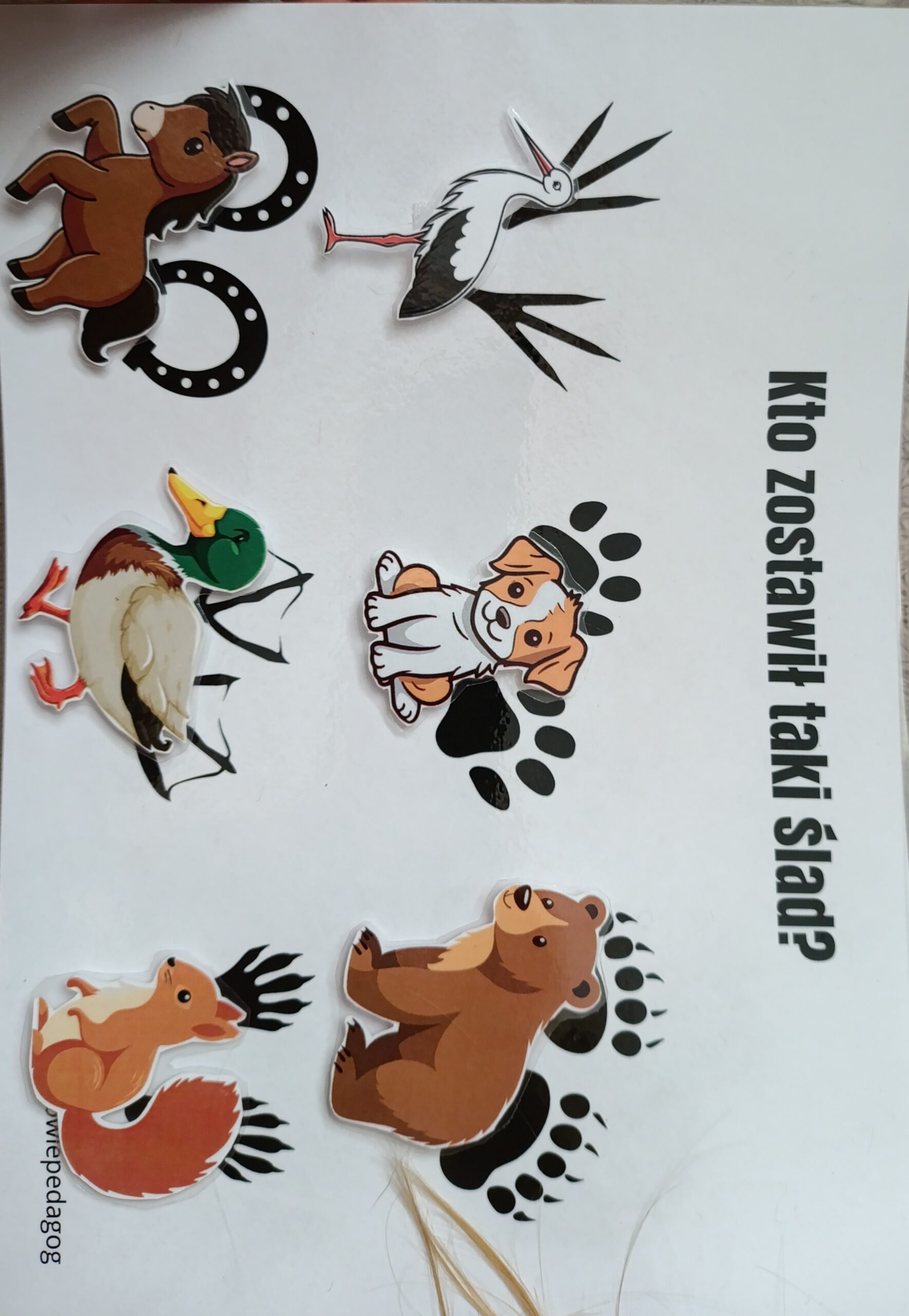 Edukacyjna książeczka z ruchomymi elementami, która uczy rozpoznawania zwierząt, ich śladów i dopasowań.